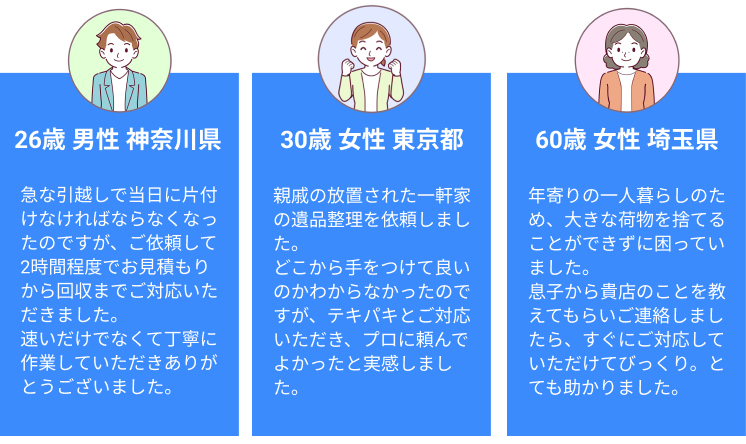 お客様の予想以上に残置物があり急ぎで困っていたようなのですが、即日に解決できて喜んでいただけました。